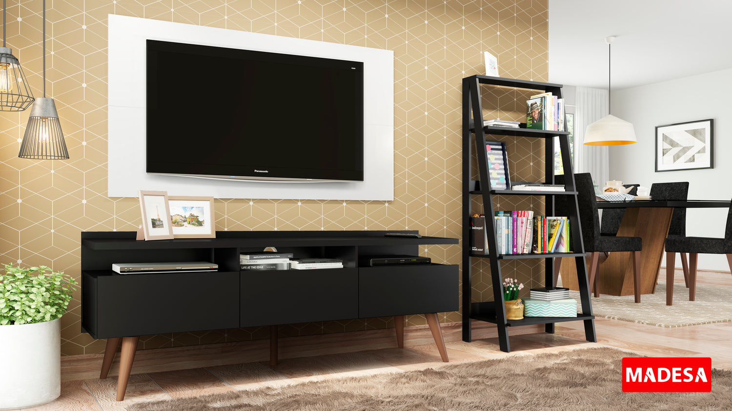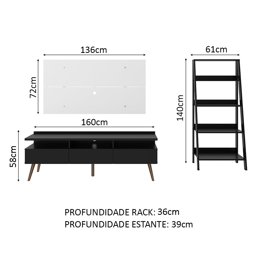 Un Rack con diseño moderno, combinado con un Panel de TV en color blanco que soporta televisores de hasta 55 pulgadas y una estantería que permite una mejor organización del ambiente, es la elección perfecta.